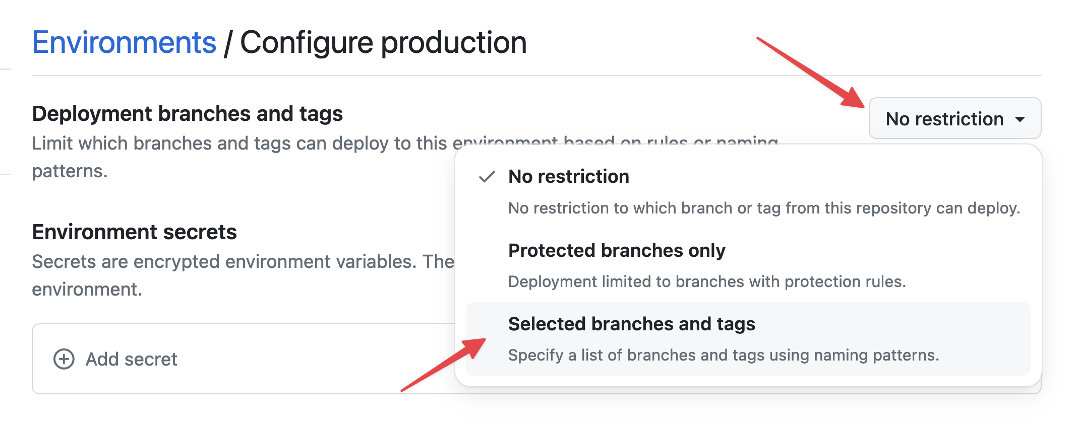 Click Add deployment branch or tag rule, enter "production" in the Name pattern field, and then click Add rule.