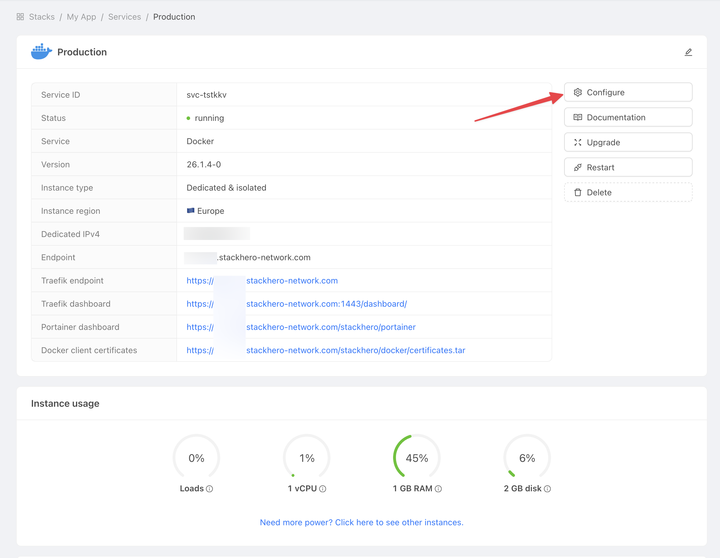 In the Stackhero dashboard, select your "production" Docker service and click the "Configure" button.