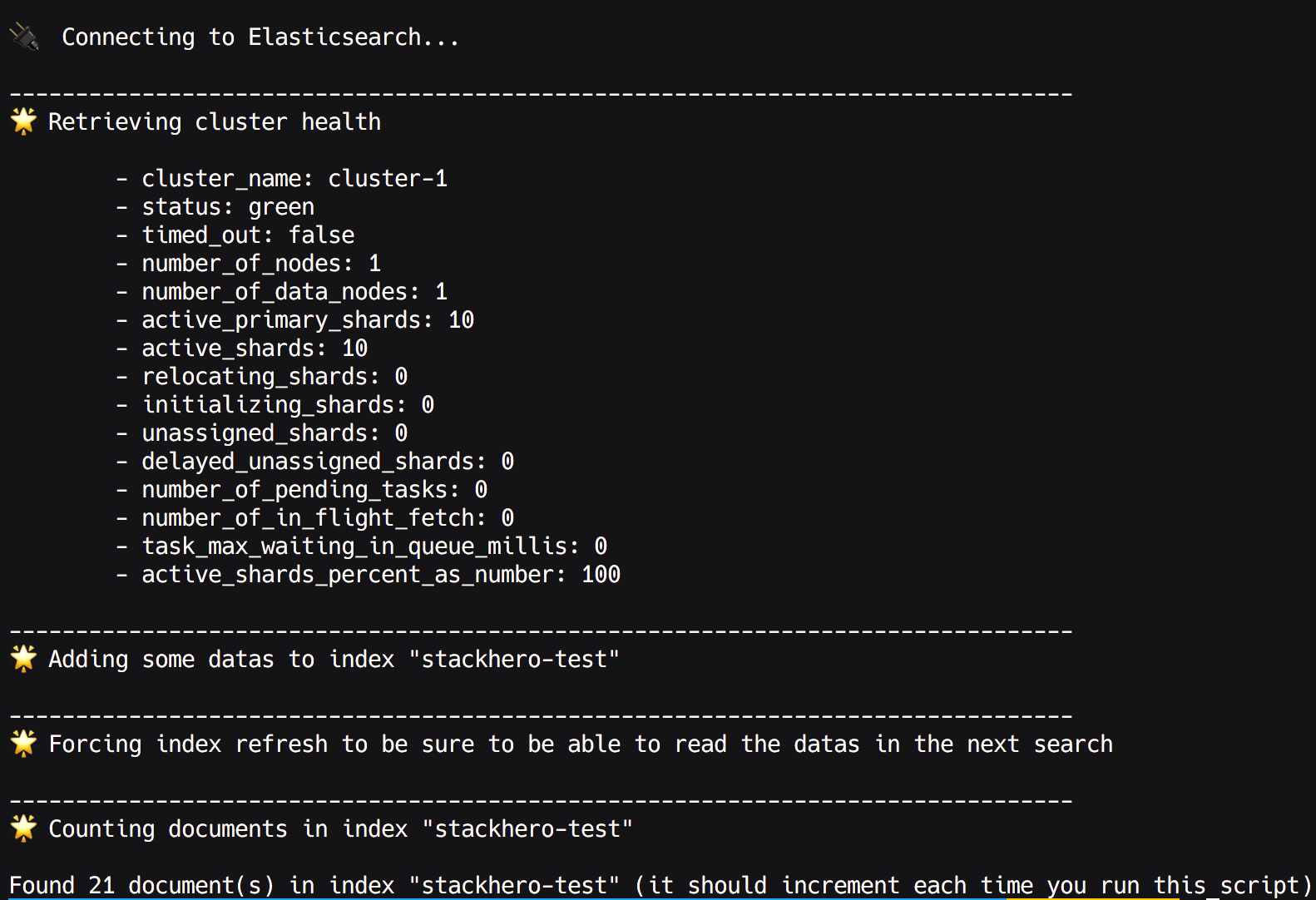 We have developed a Node.js script that helps you monitor your Elasticsearch cluster status and write random data. This setup allows you to verify that everything is working correctly.