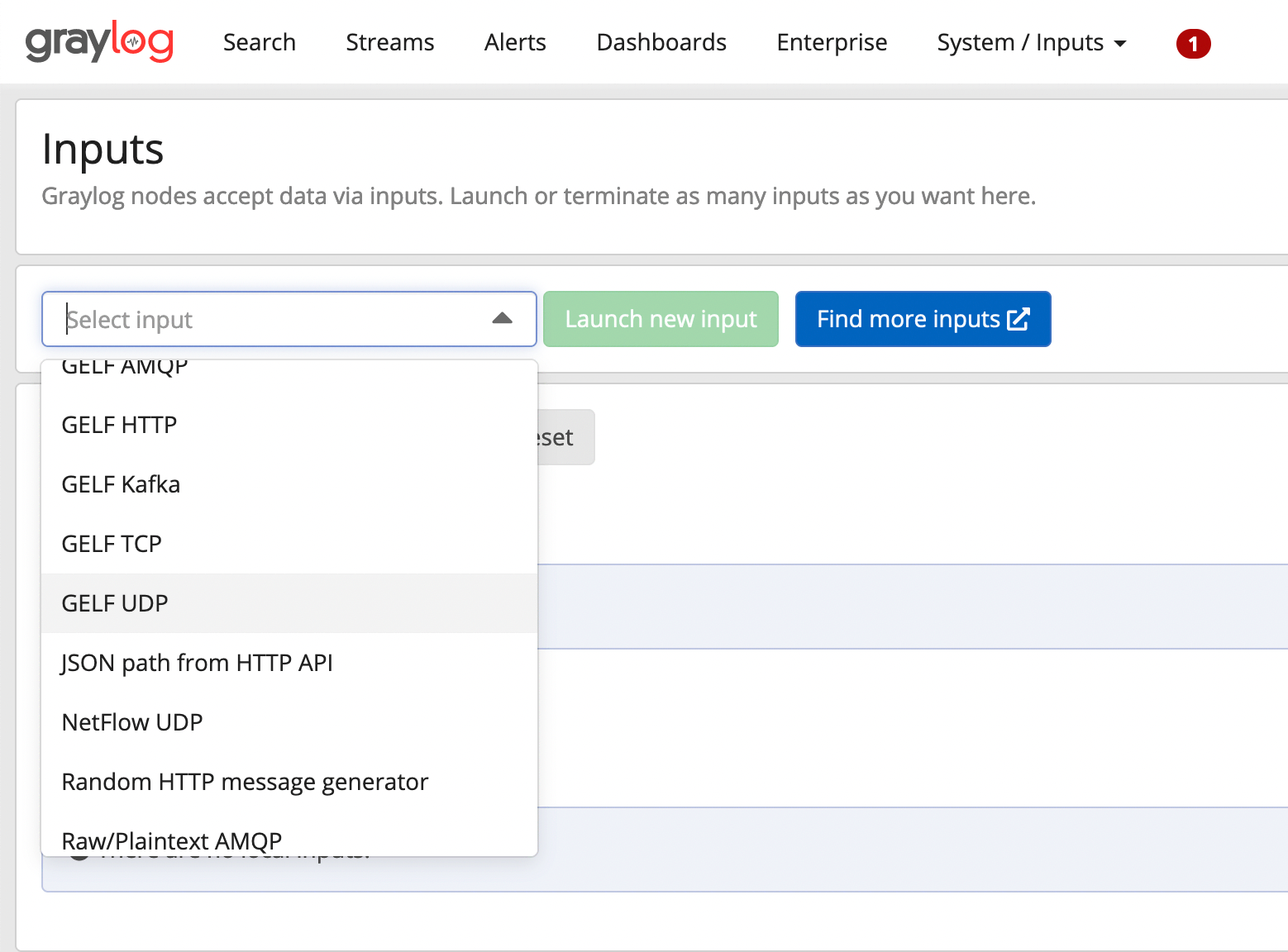 Selecting an input on Graylog web UI -