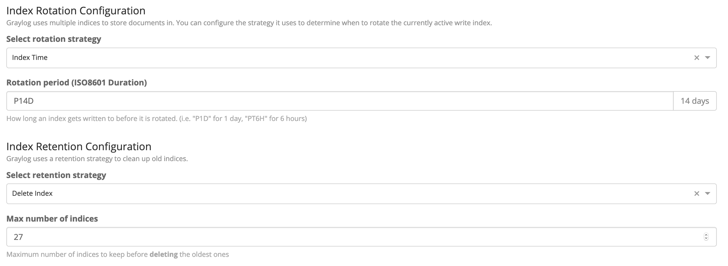 In the example below, the configuration sets a maximum of 27 indices, with each index retaining 14 days of logs. This setup retains logs for approximately a year (378 days).