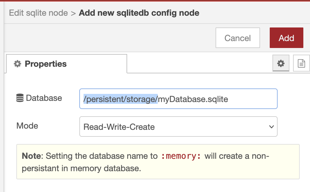 In this example, we will use the node-red-node-sqlite node. This node requires a directory to store its data.