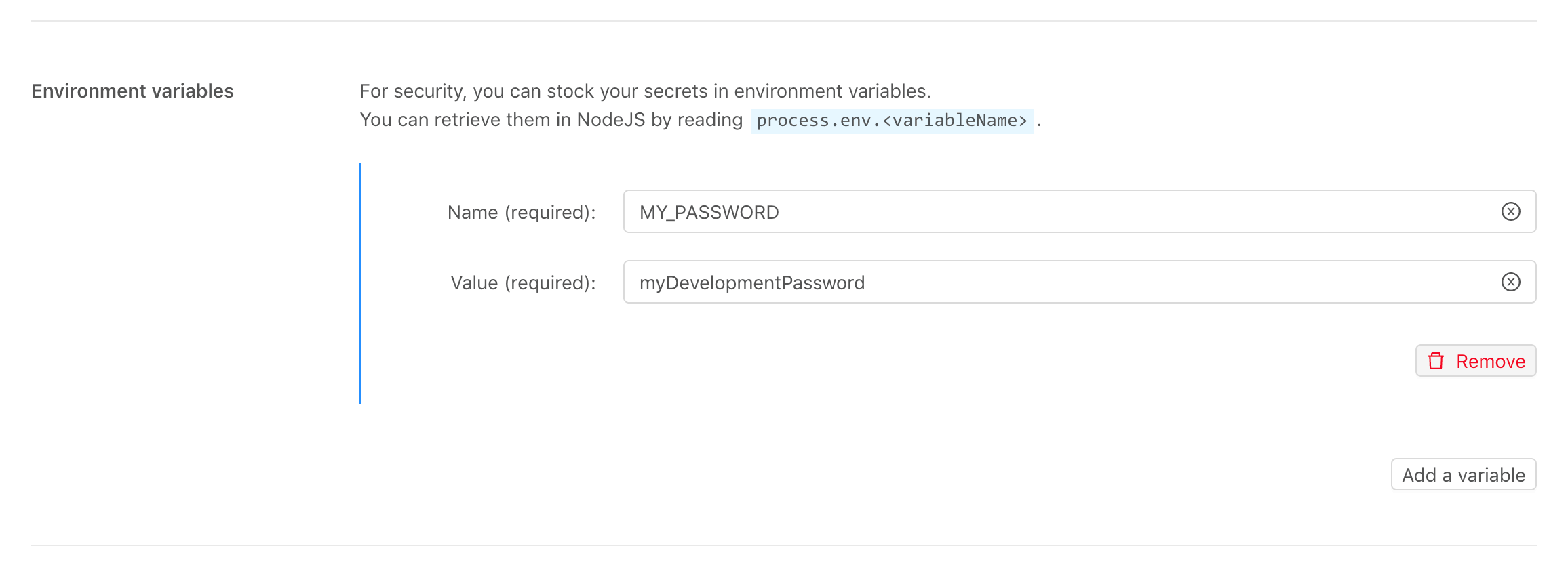 If you are using Stackhero in a production environment, you can define a new environment variable named MY_PASSWORD with the value myProductionPassword right from your Node.js service dashboard. This makes it easy to keep things running smoothly between environments.