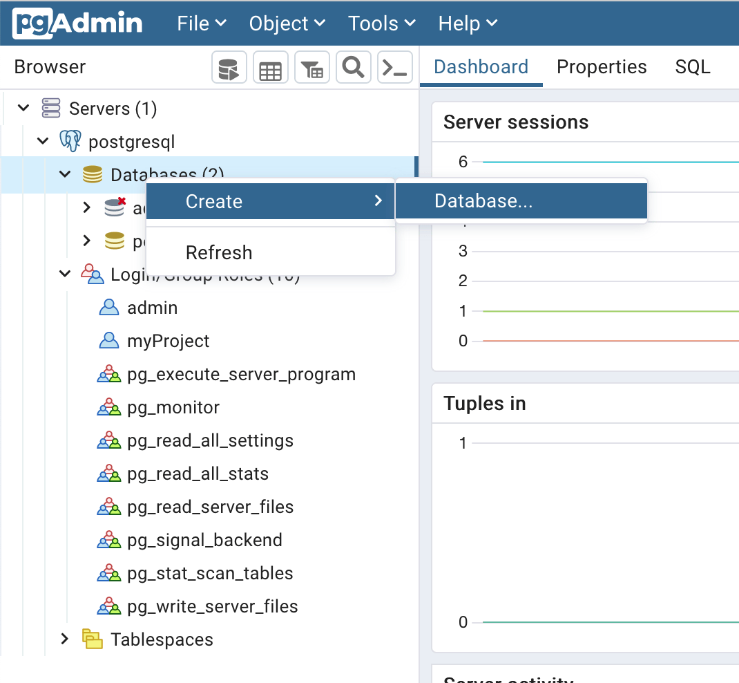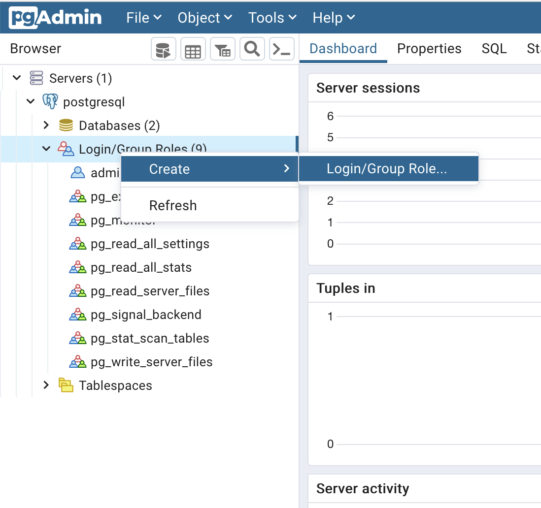1. Go to Servers / PostgreSQL, right-click on Login/Group Roles, and select Create / Login/Group Role: