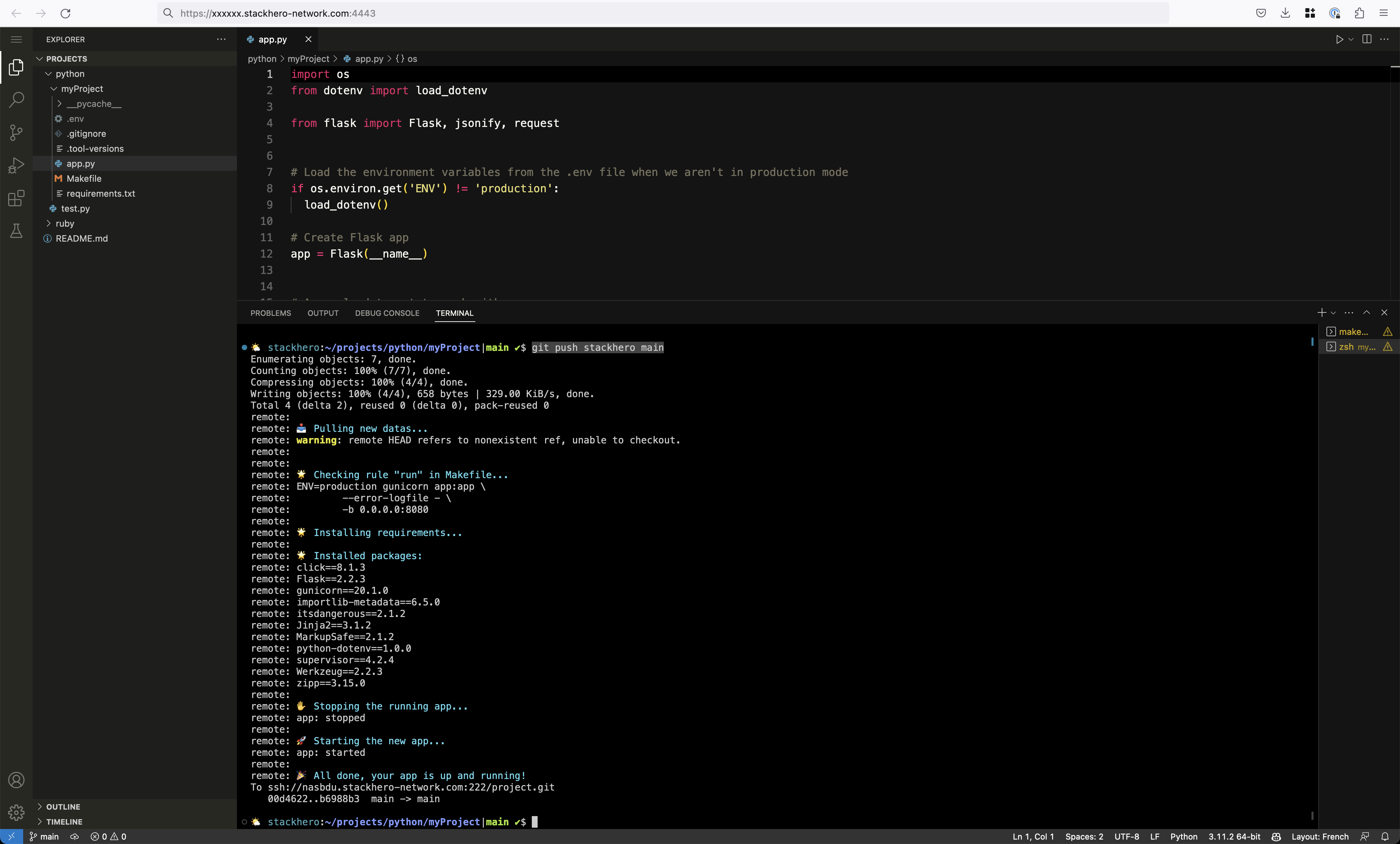 Once everything is set up, you are ready to deploy. From your project directory, you can use this command to push your code to Stackhero: