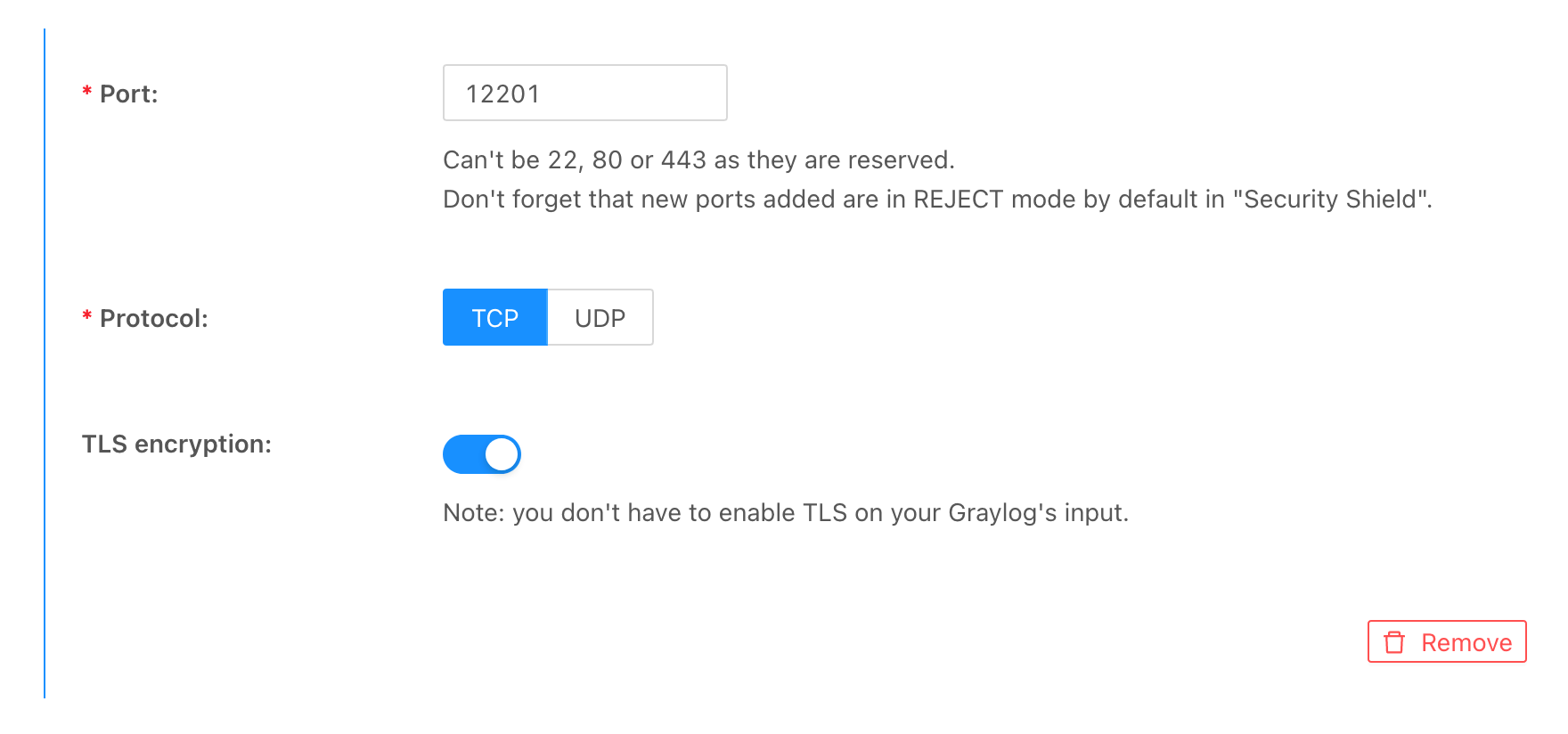 - Bestätigen Sie, dass der Port 12201 sowohl für TCP als auch TLS im Abschnitt Input Ports aktiviert ist. Passen Sie die Einstellungen bei Bedarf an.
