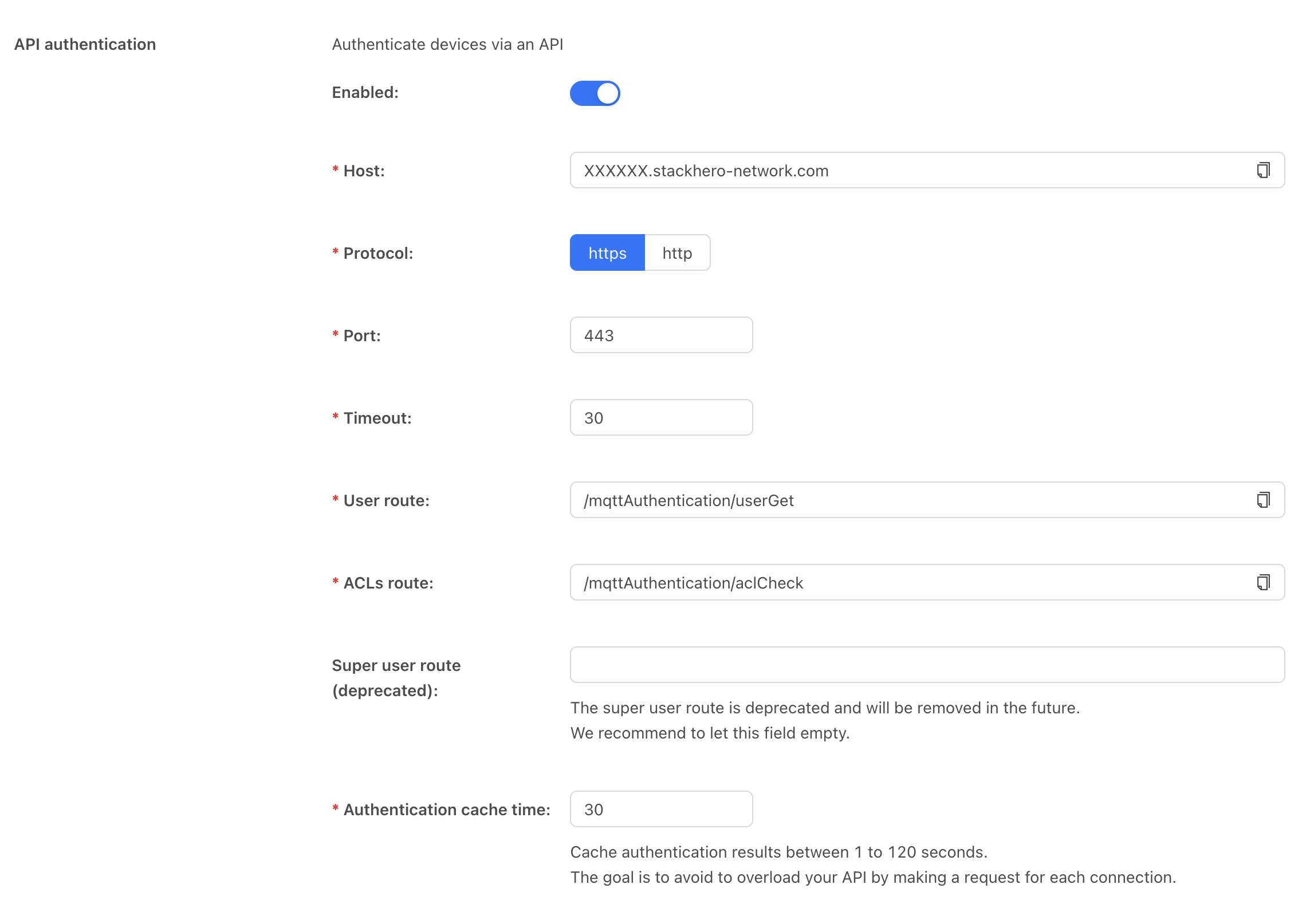 The simplest method works well if you have fewer than 20 devices and do not require advanced ACL controls. In this case, you can create an individual login and password for each device in your service configuration on the Stackhero dashboard.