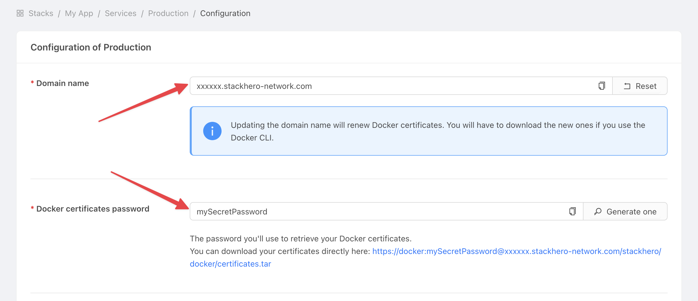 Kad GitHub Actions galėtų prisijungti prie jūsų Stackhero Docker paslaugos, jums reikia dviejų informacijos dalių: jūsų paslaugos domeno vardo ir sertifikatų slaptažodžio.
