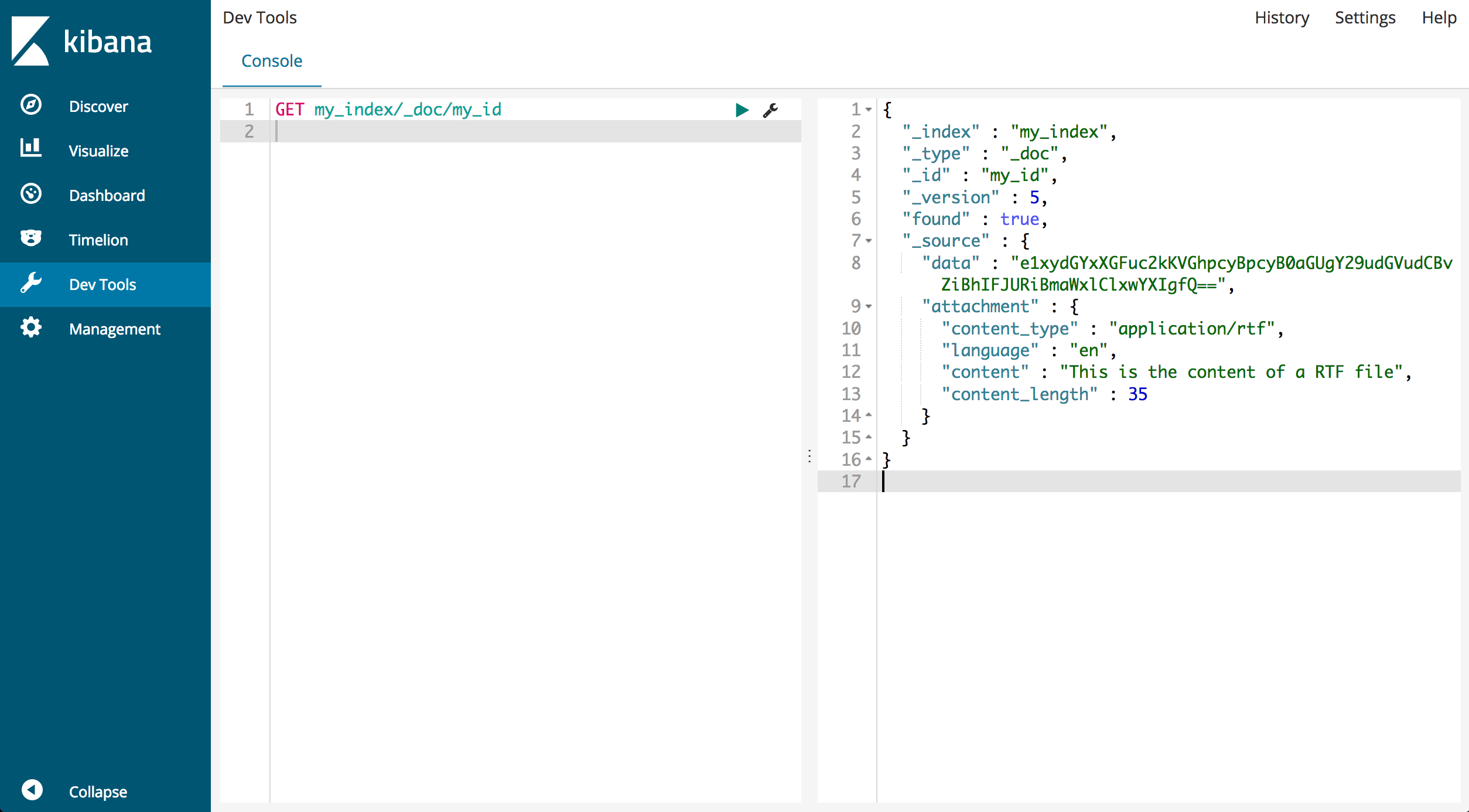 Merk op dat het _source-veld nu zowel de originele Base64-gegevens als de geëxtraheerde bijlagegegevens zoals bestandstype en inhoud bevat.