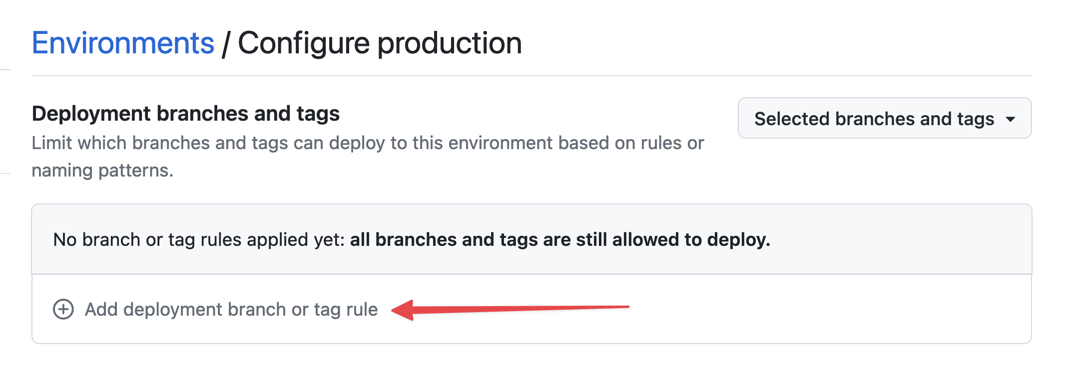 Add deployment branch or tag rule, wpisz "production" w poluName patterni kliknijAdd rule.