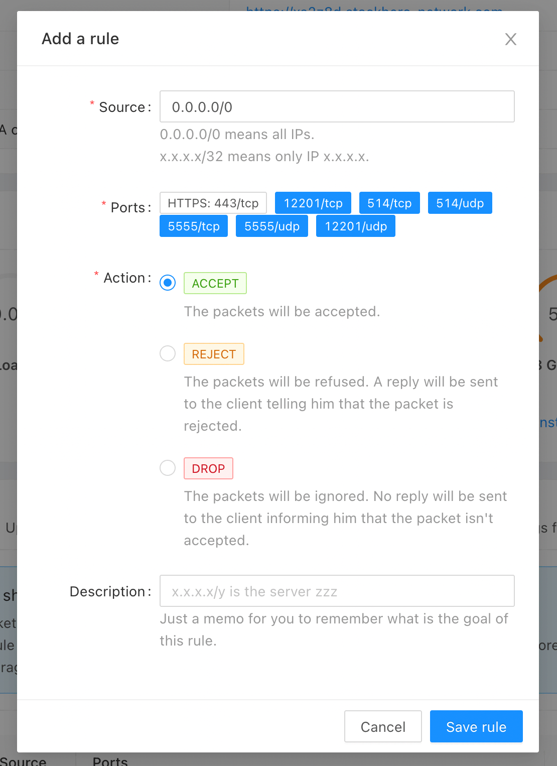 0.0.0.0/0para qualquer IP), e especifique as portas que receberão dados deste IP. - Escolha a ação