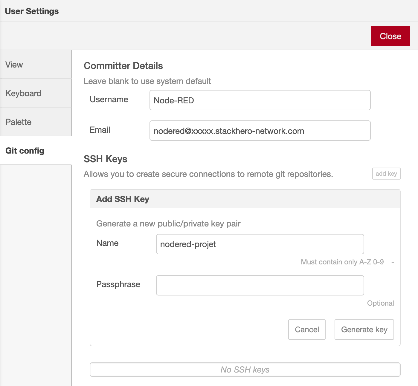 Na secção "Committer Details", forneça o seu nome de utilizador Git e endereço de email. Estes detalhes associam os seus commits Git à sua identidade. Para consistência, pode escolher Node-RED como nome de utilizador e usar um formato de email como [email protected], substituindo xxxxx.stackhero-network.com pelo domínio da sua instância Node-RED.