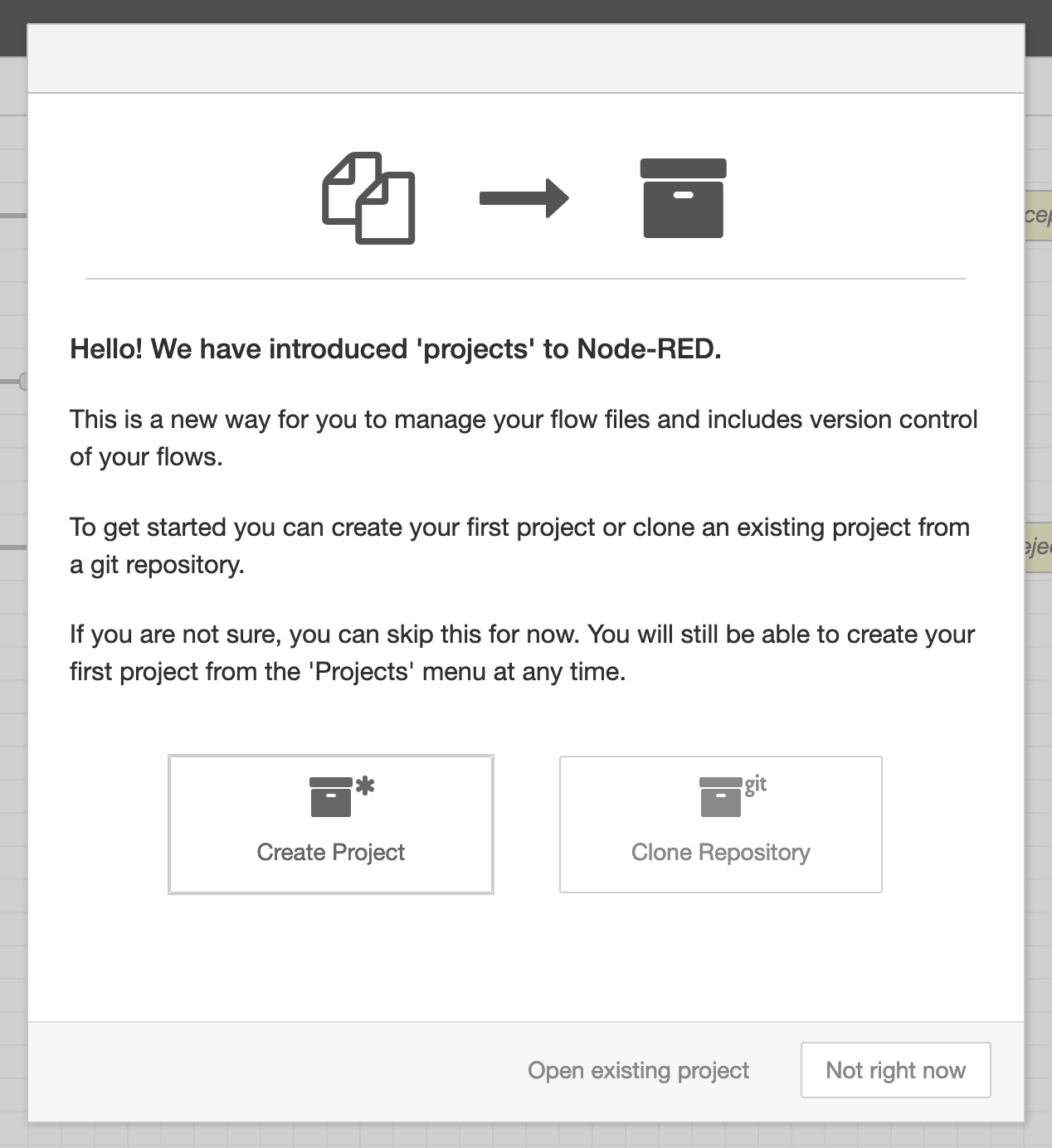 Para novos repositórios, o Node-RED pode solicitar que crie ficheiros de projeto padrão. Se solicitado, selecione Create default project file.