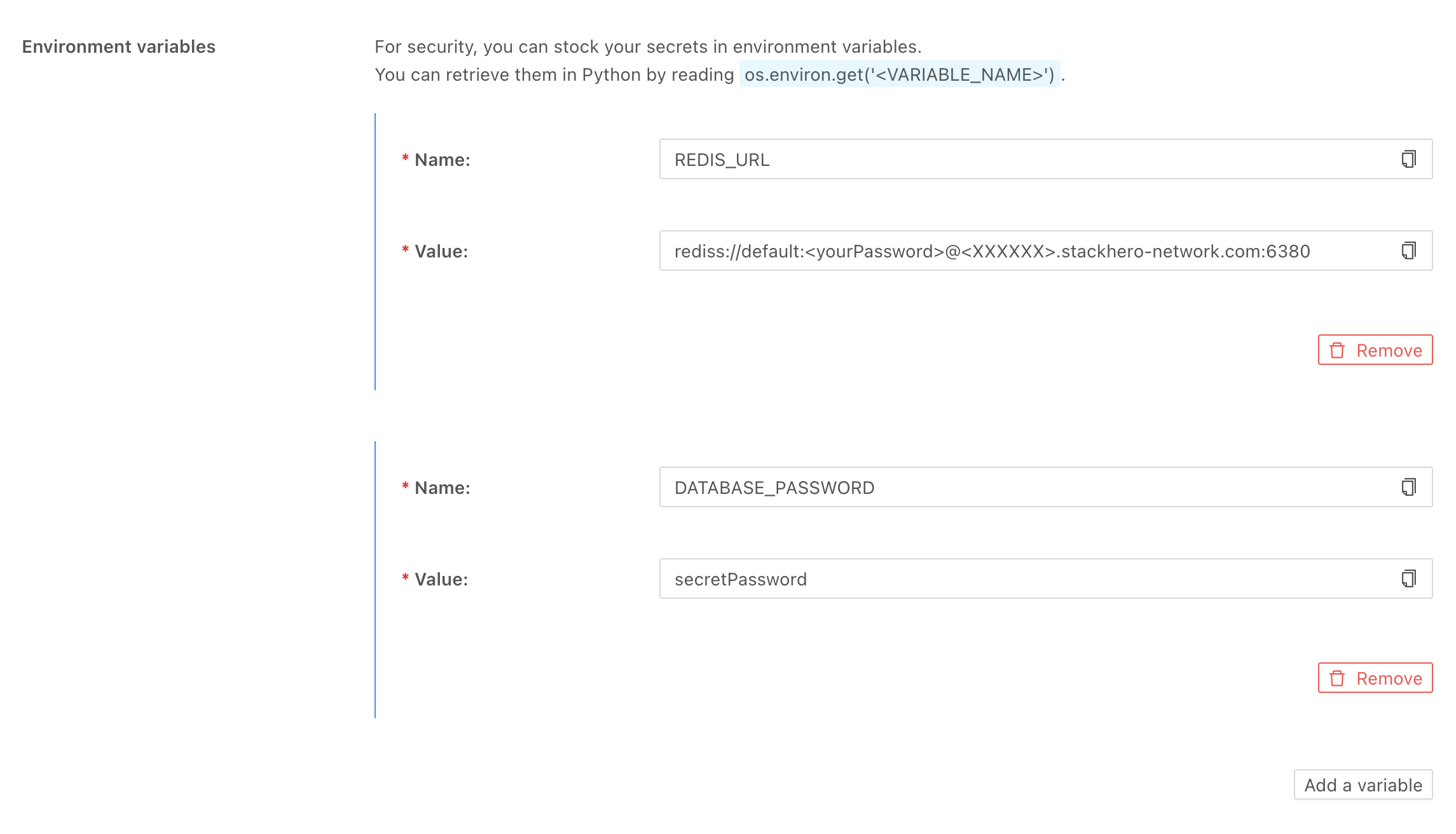 O ficheiro .env não é suficientemente seguro para ambientes de staging e produção. Em vez disso, o Stackhero permite que armazene com segurança as suas variáveis de ambiente diretamente na configuração do seu serviço Python.